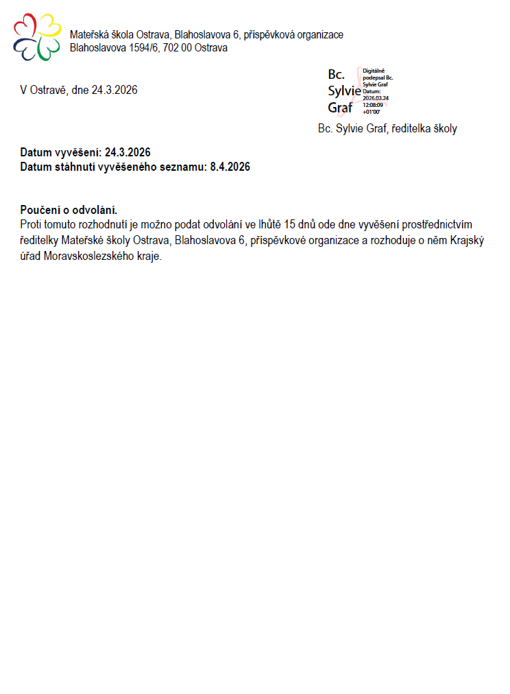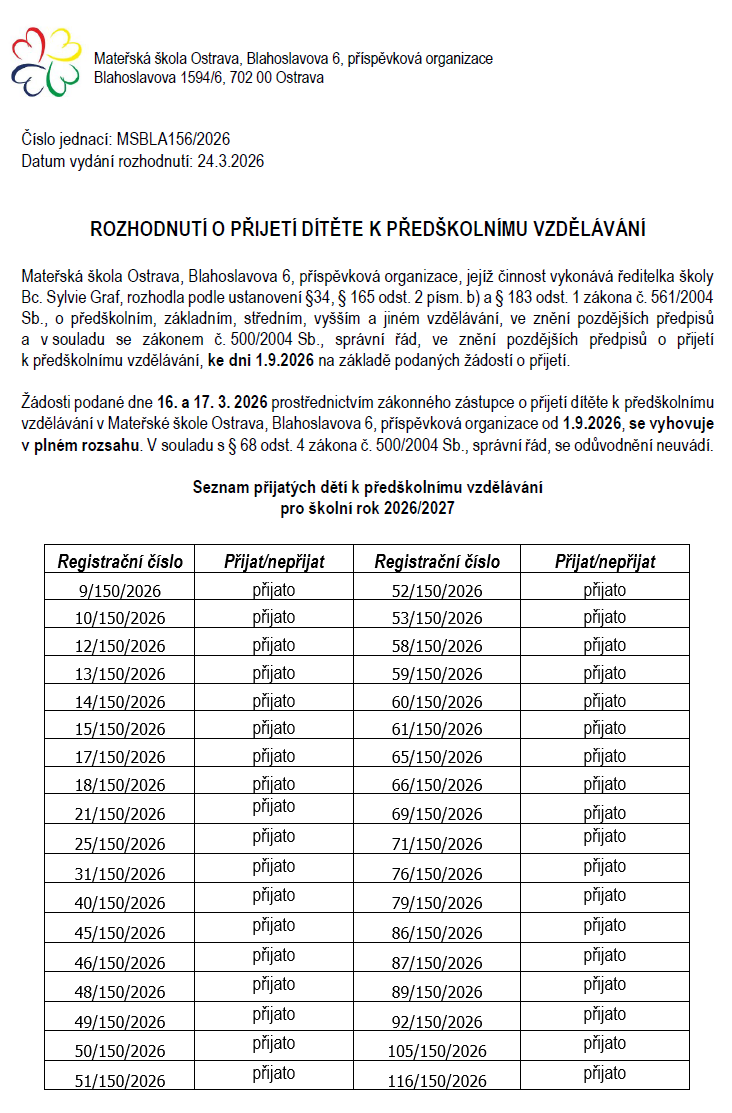 VÝSLEDKY PŘIJÍMACÍHO ŘÍZENÍ DO MŠ 2026/2027